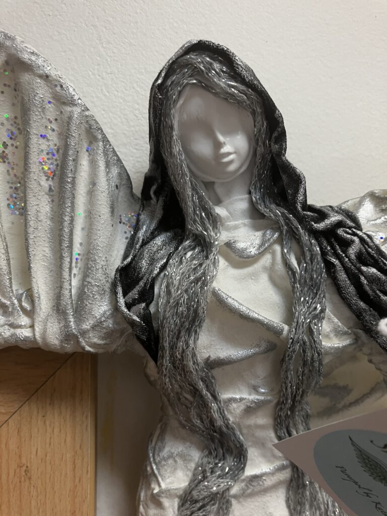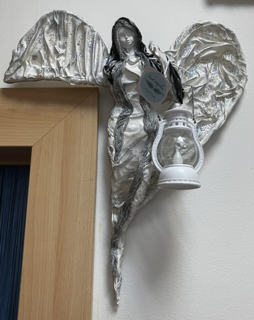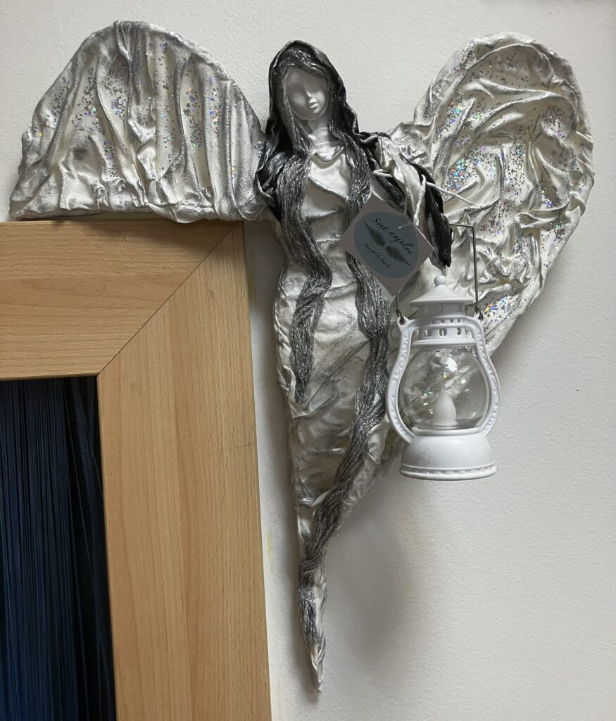 Dekorácia anjel na zárubni s lampášom – sivá