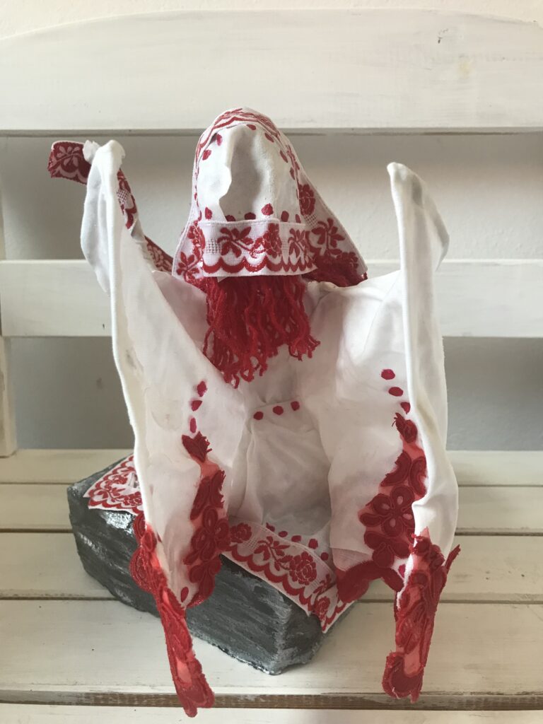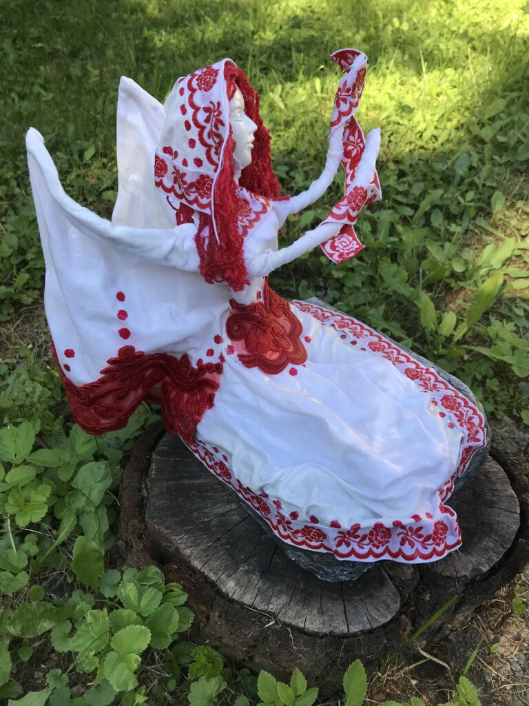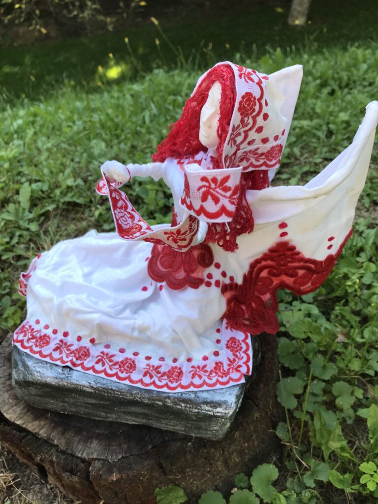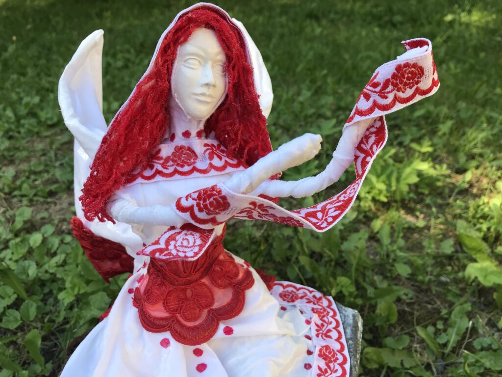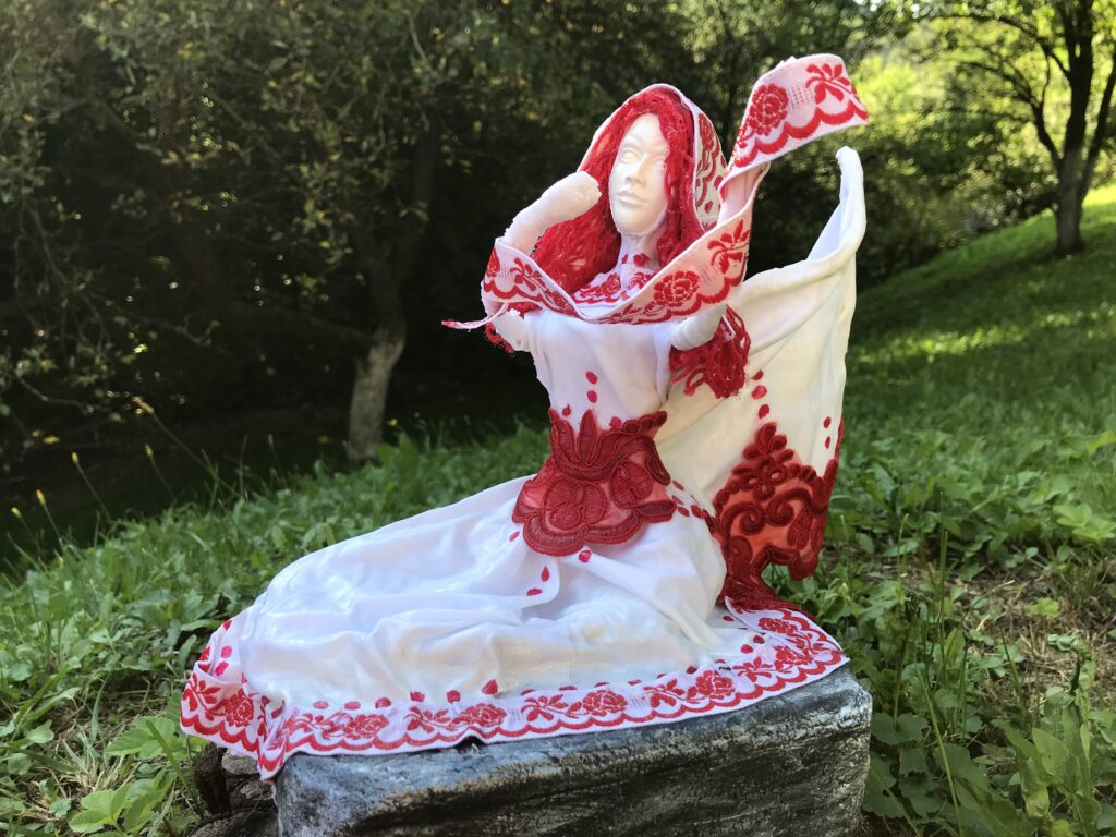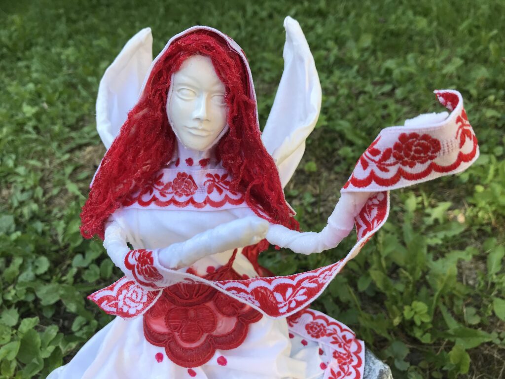 Socha sediaci anjel s červenými vlasmi