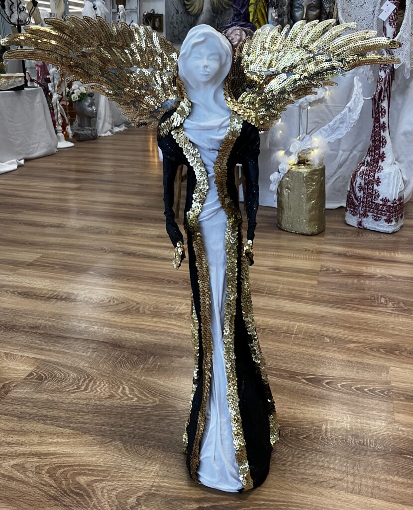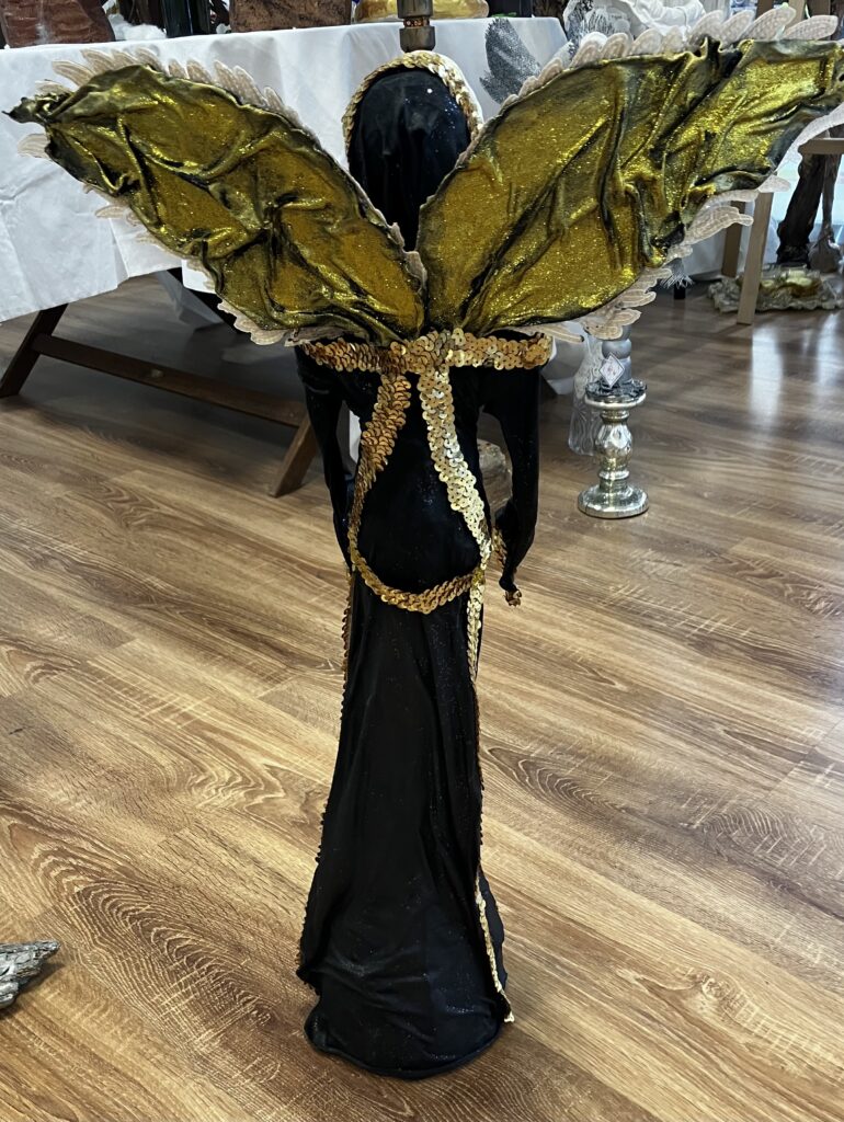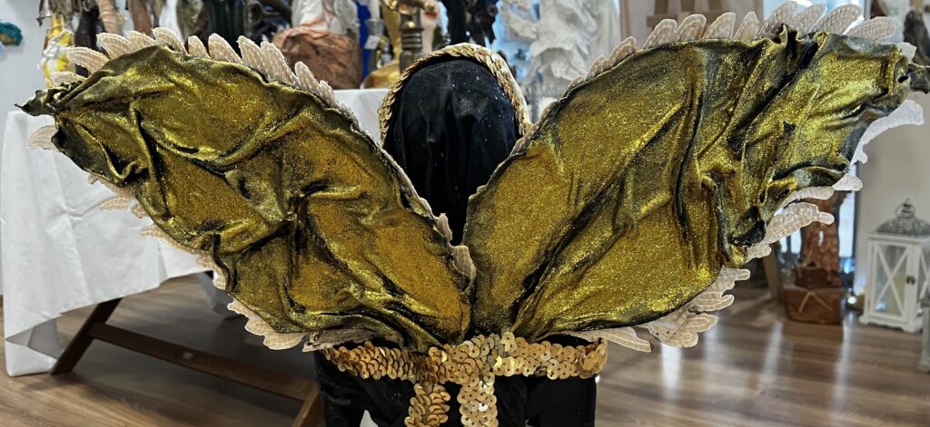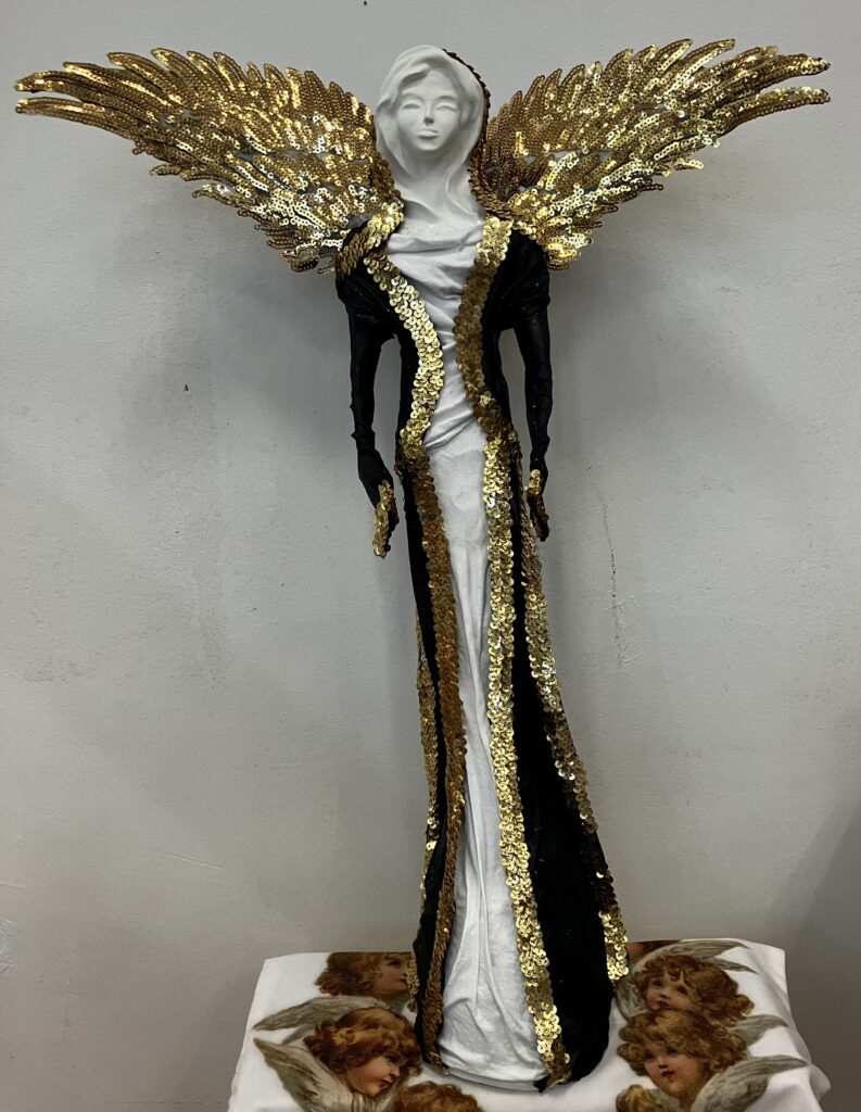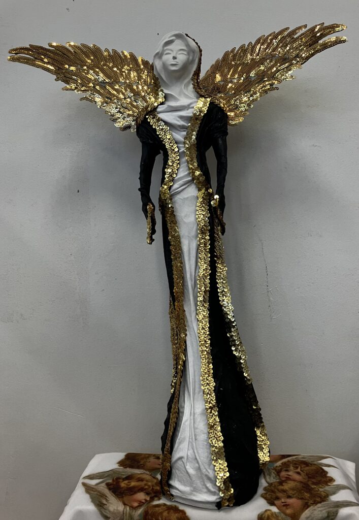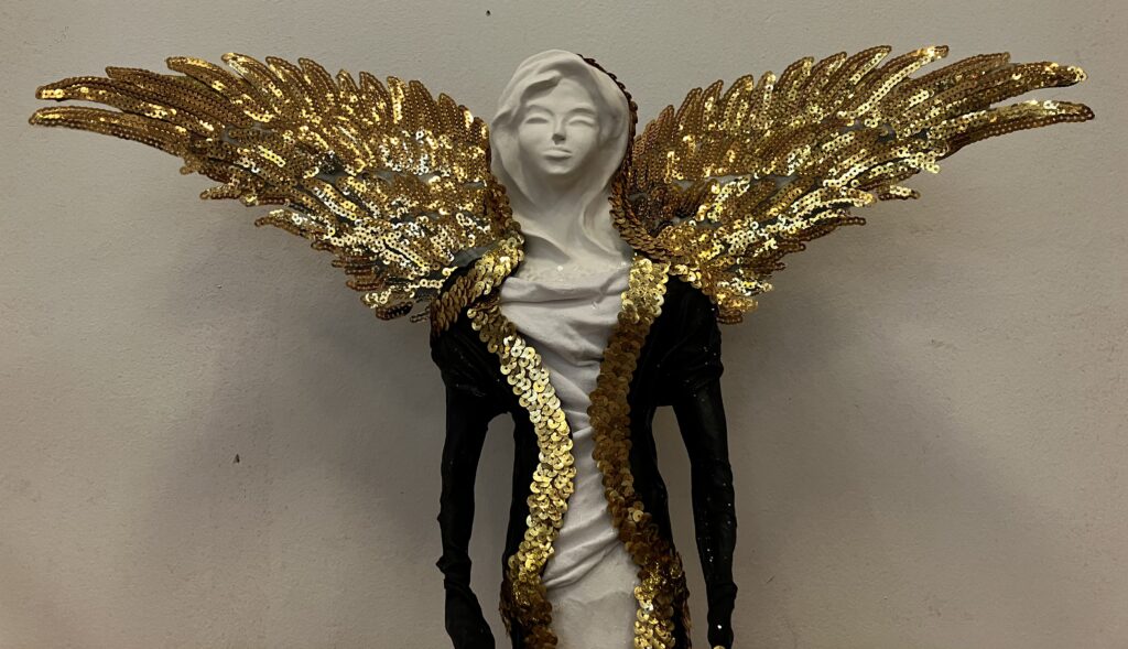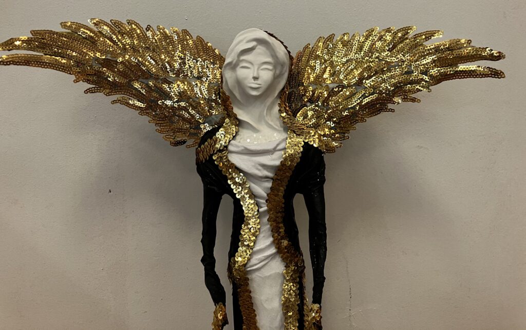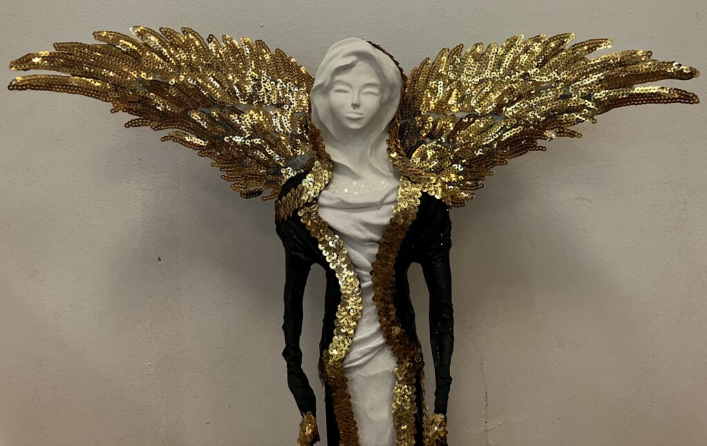 Paverpol,ručne modelovaná tvár, zlatá flitrová krajka, krídla, Acryl, V-73cm,šírka krídel-52cm