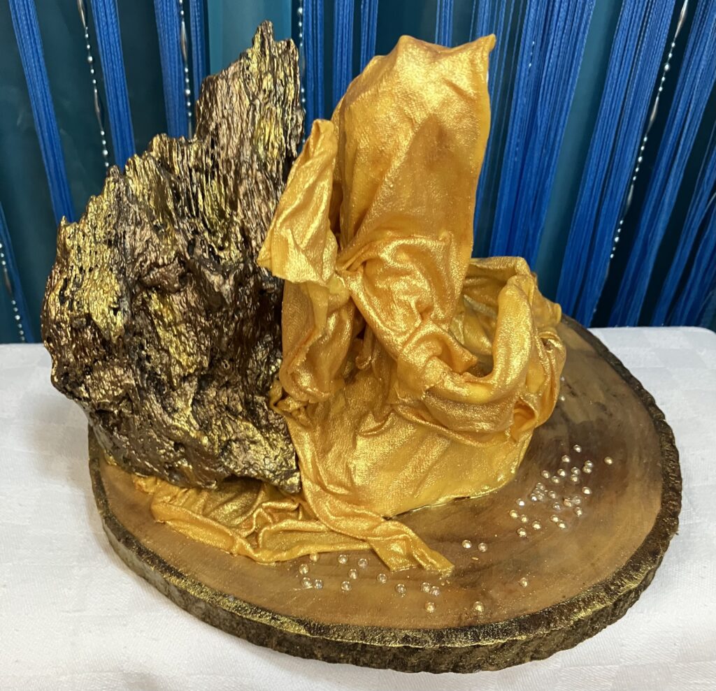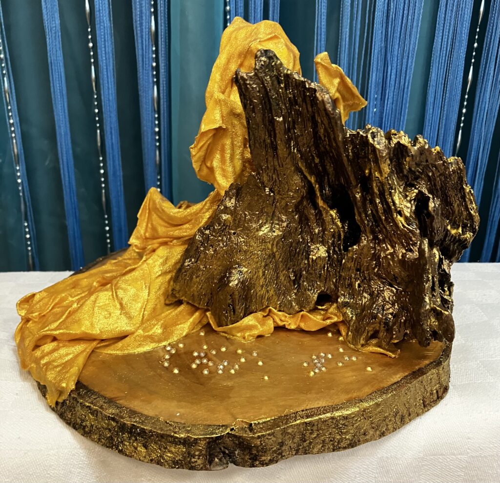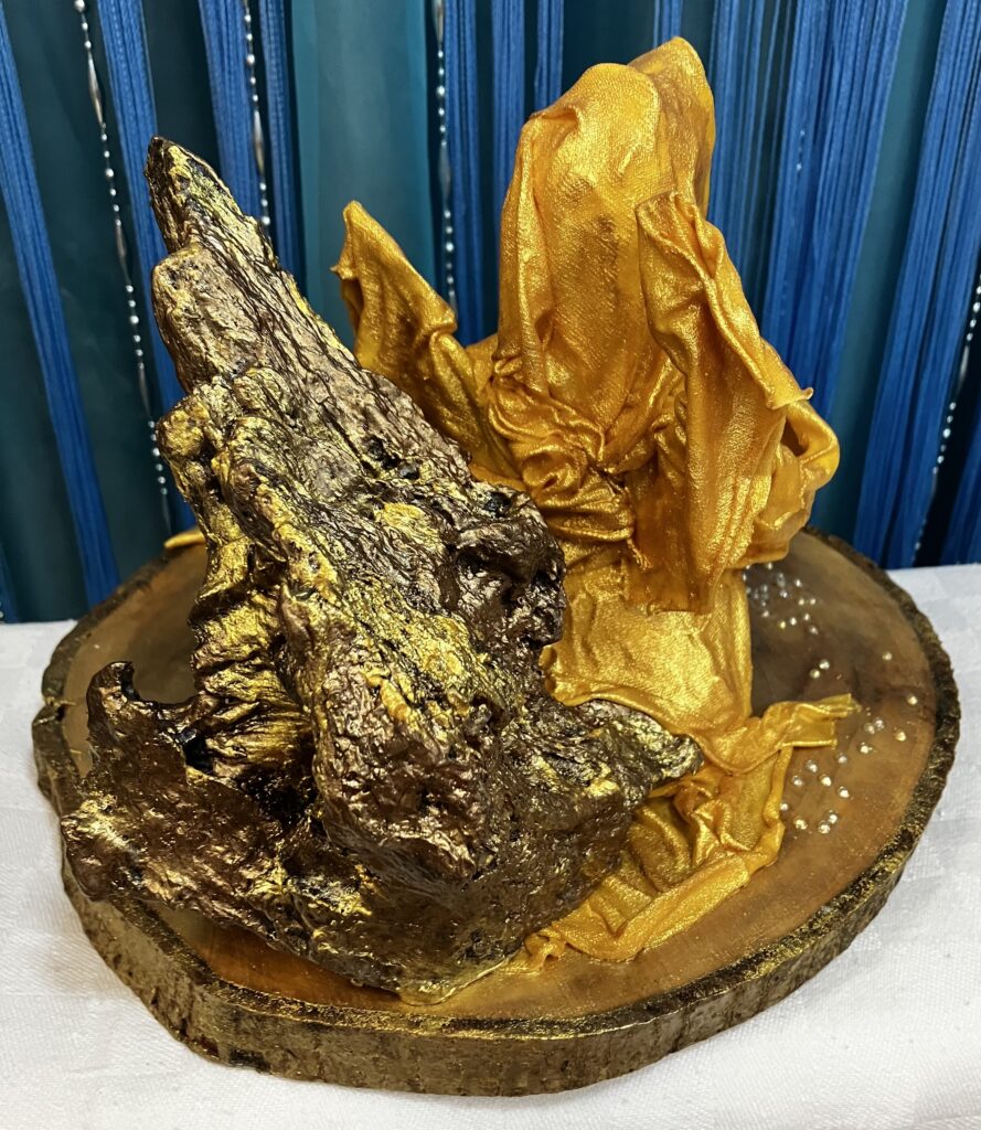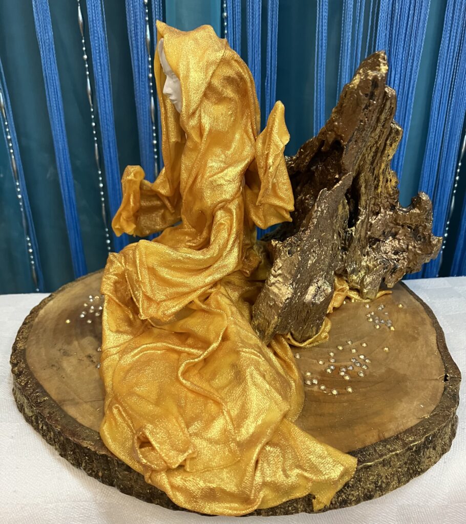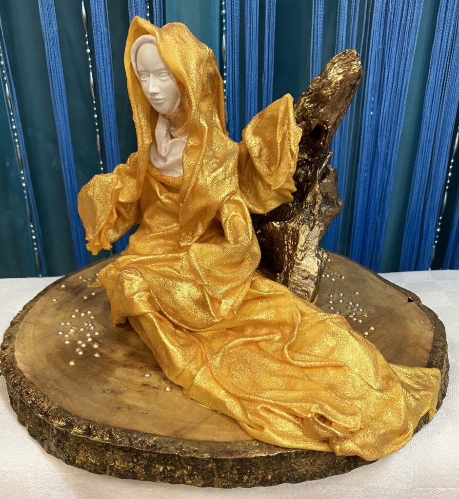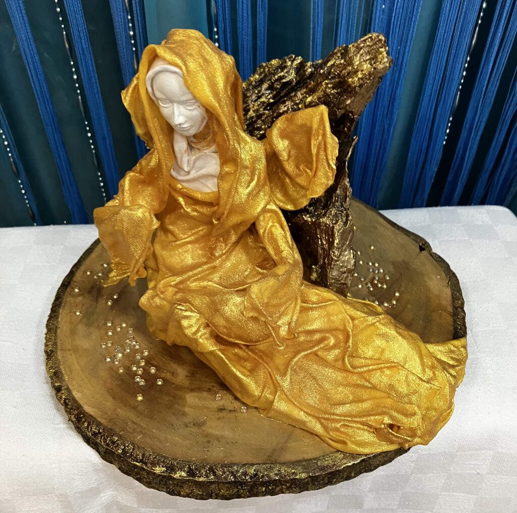 Zlatý anjel na drevenom podstavci so samorastom