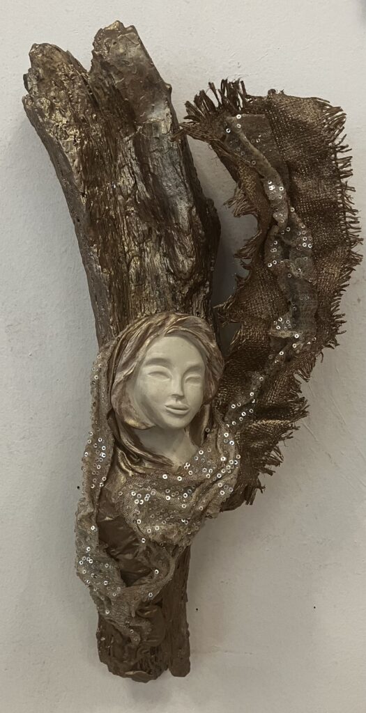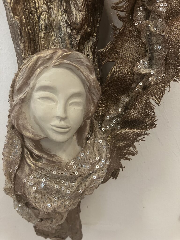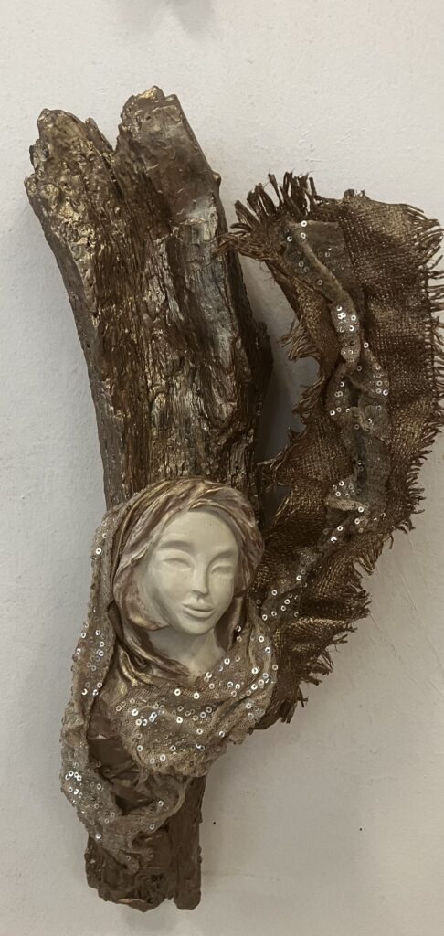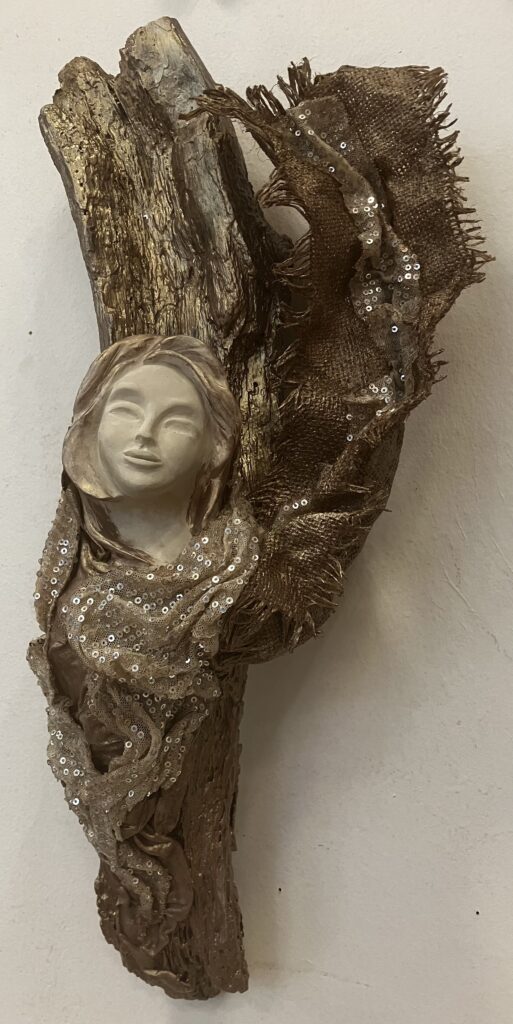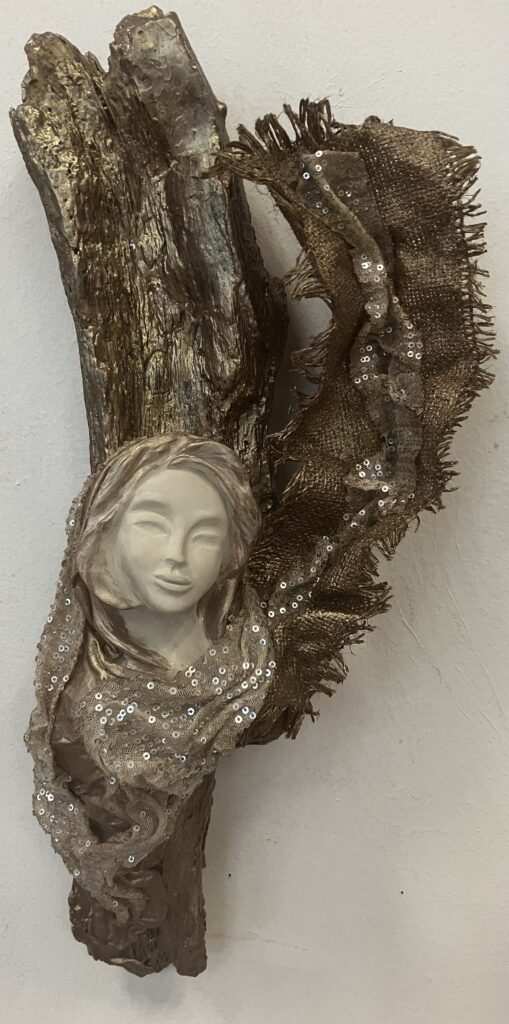 Paverpol, drevený samorast, ručne modelovaná tvár, Acryl farba, ozdobné tkaniny, V: 51cm, Š:20cm