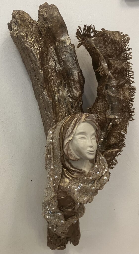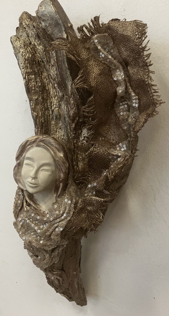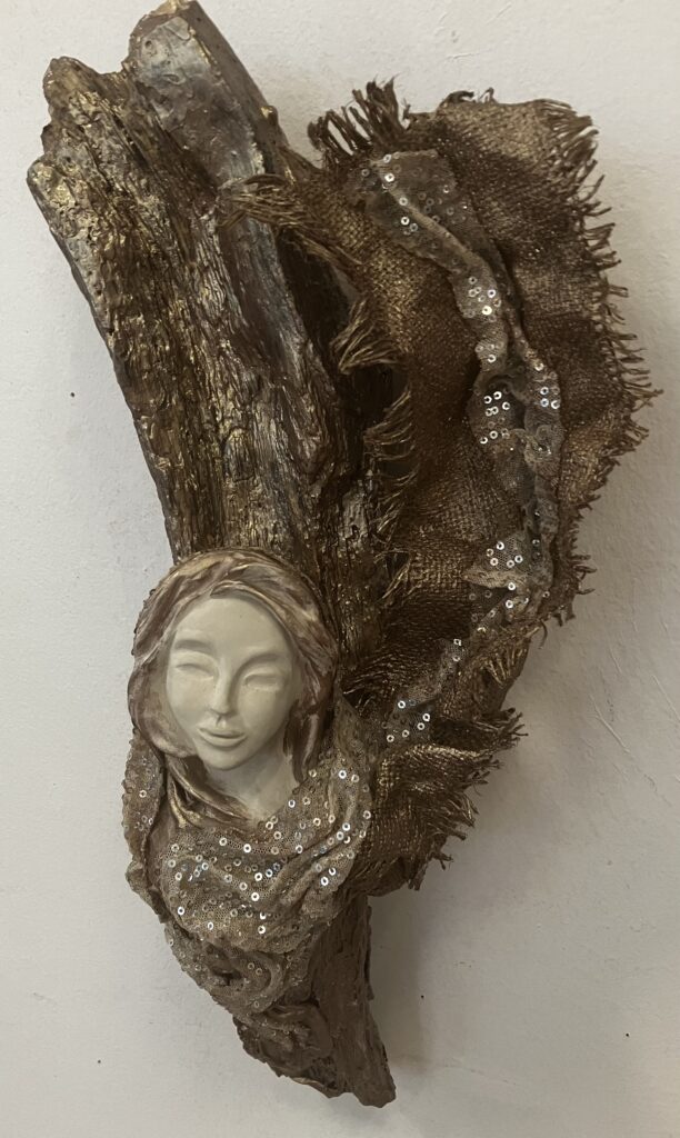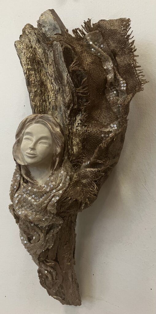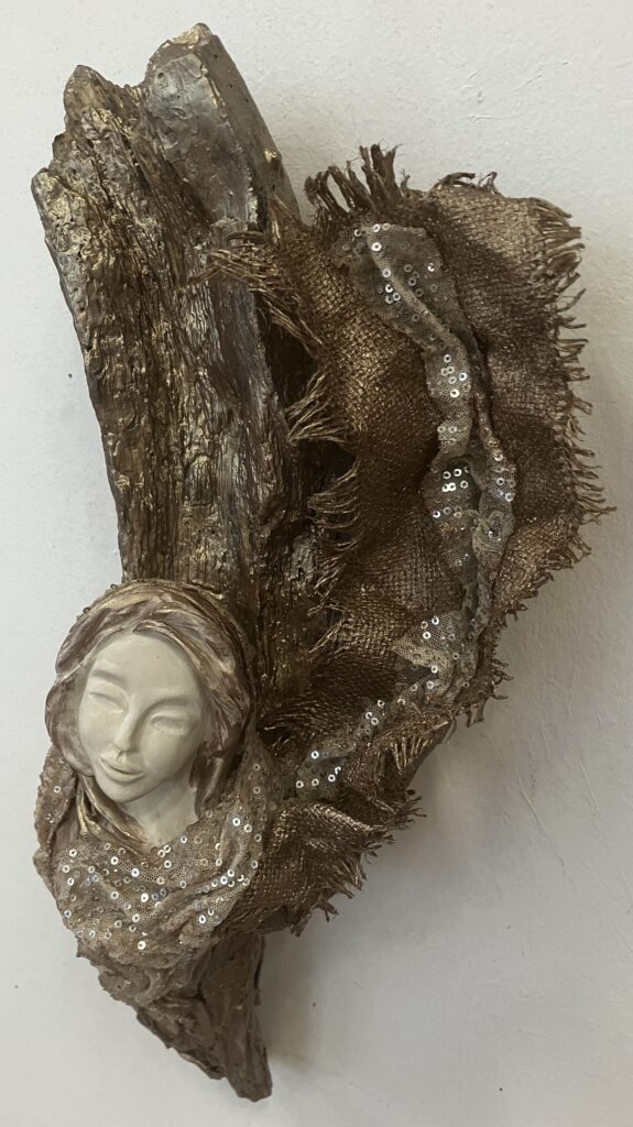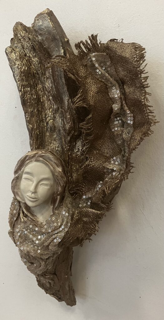 Paverpol, drevený samorast, ručne modelovaná tvár, Acryl farba, ozdobné tkaniny, V: 51cm, Š:20cm