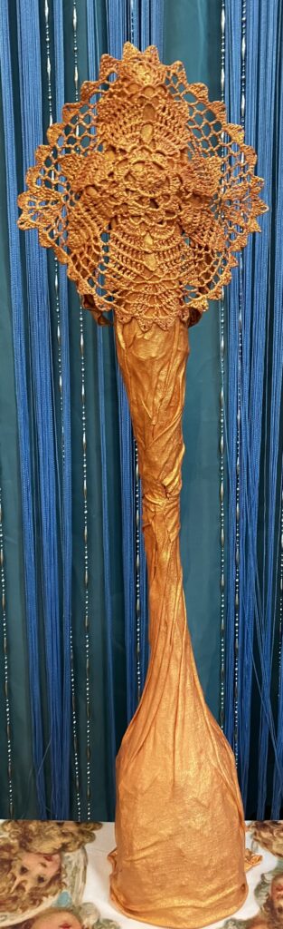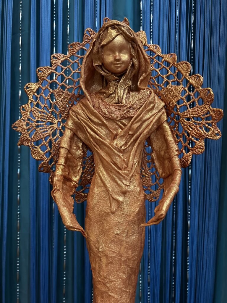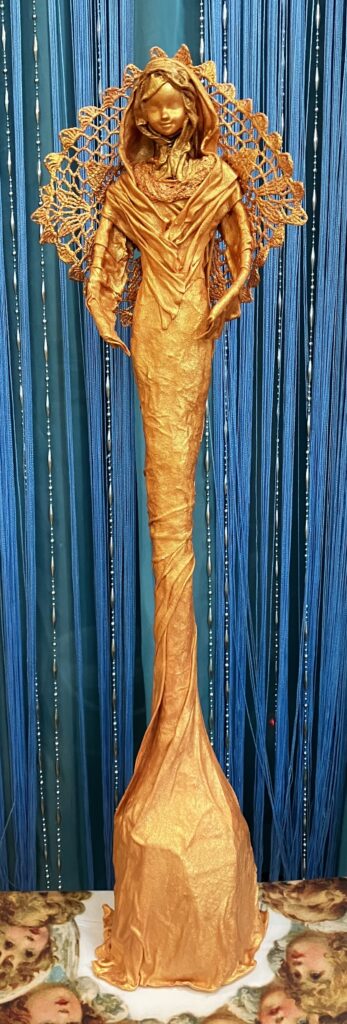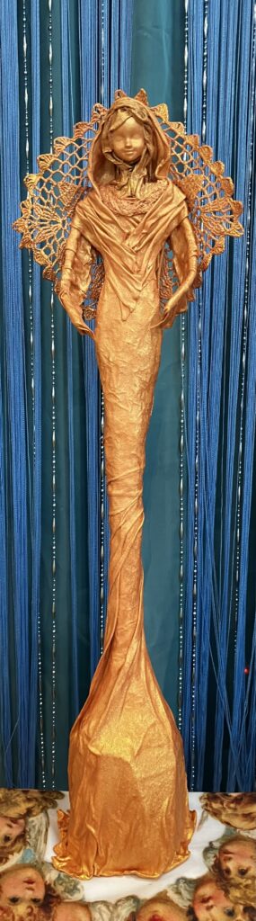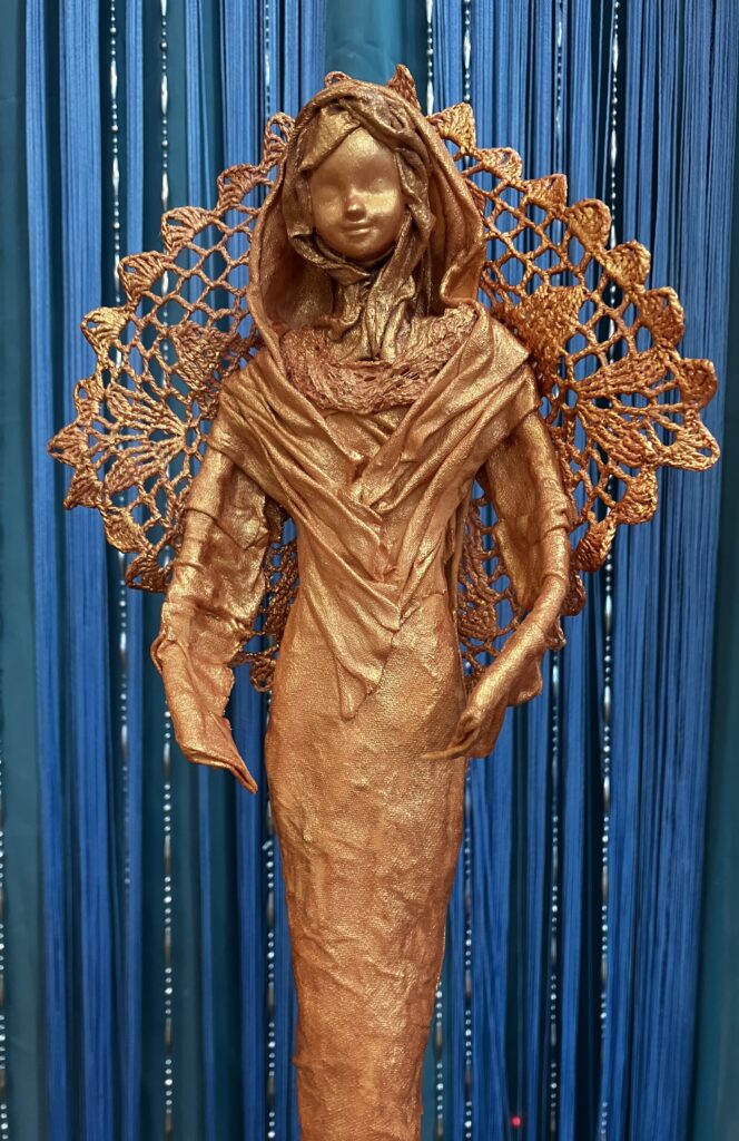 Anjel v ružovom zlate Pridané: 28. júla 2023 Sochy Paverpol, Acryl farba, ručne háčkované krídla,V:67cm, Š:20cm