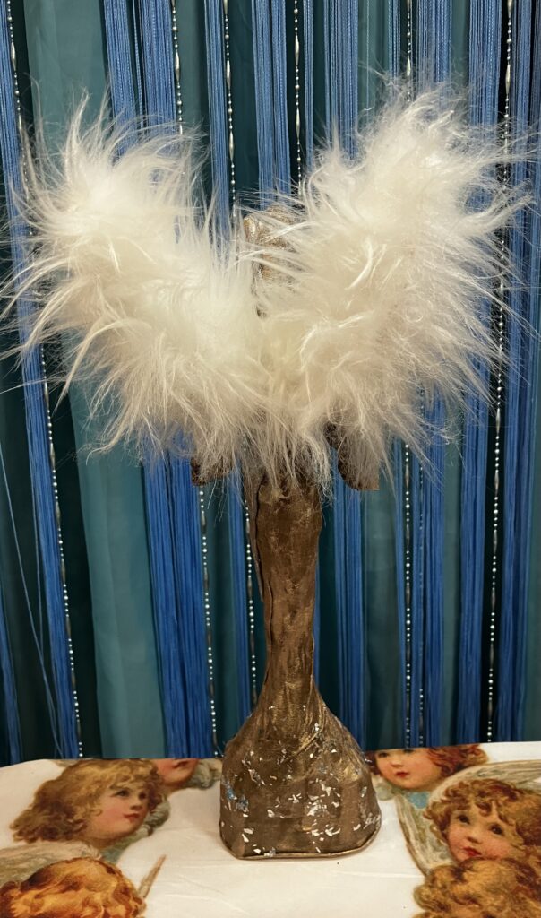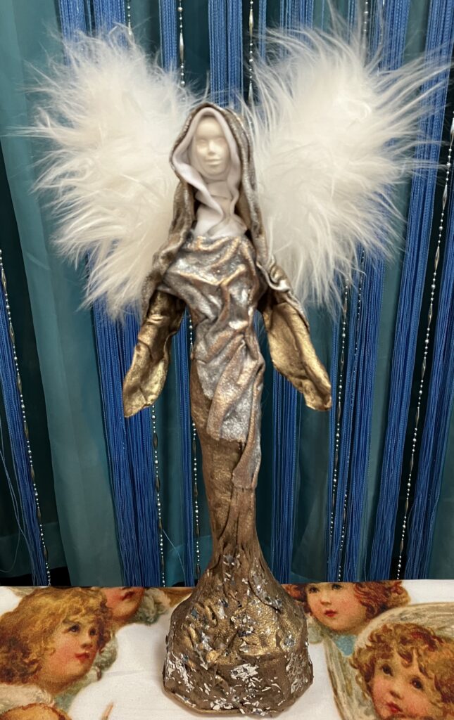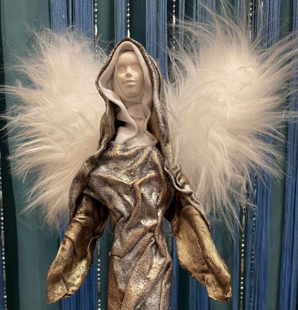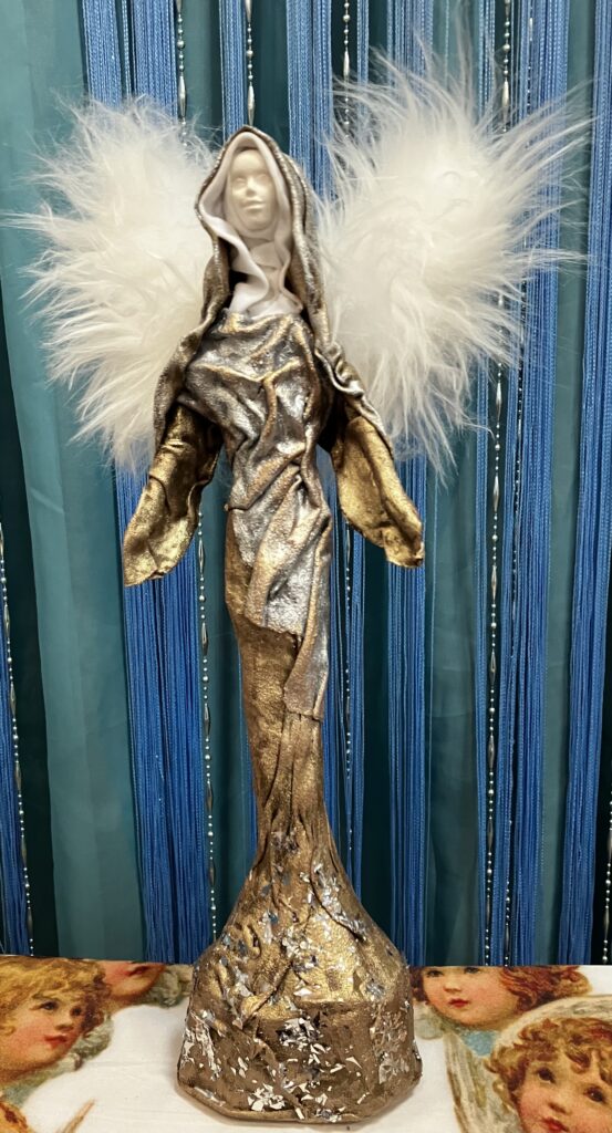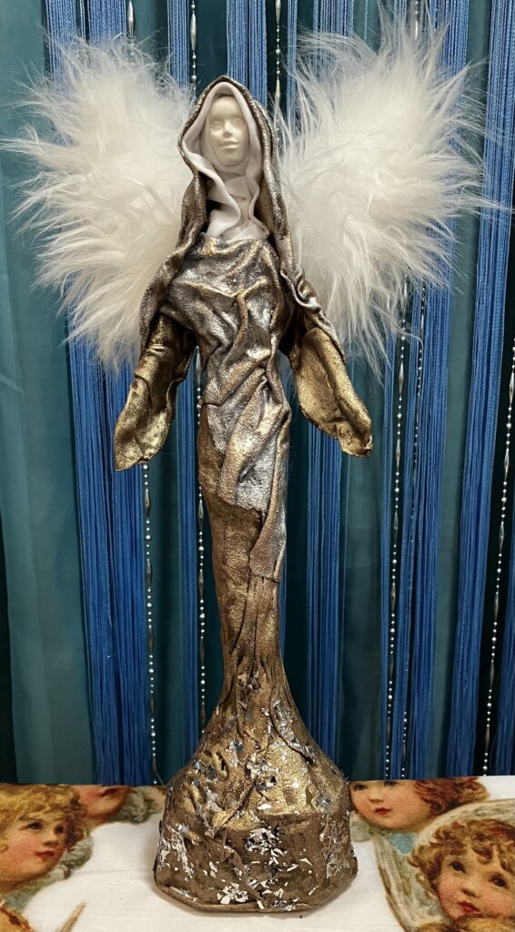 Paverpol, acryl, spodok šiat posypaný striebornými kúskami, volne spustené ruky, V:39cm, Š:20cm