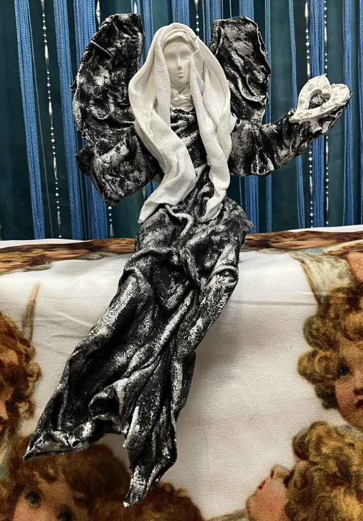 Sediaci čierno- biely anjel s bielym srdiečkom