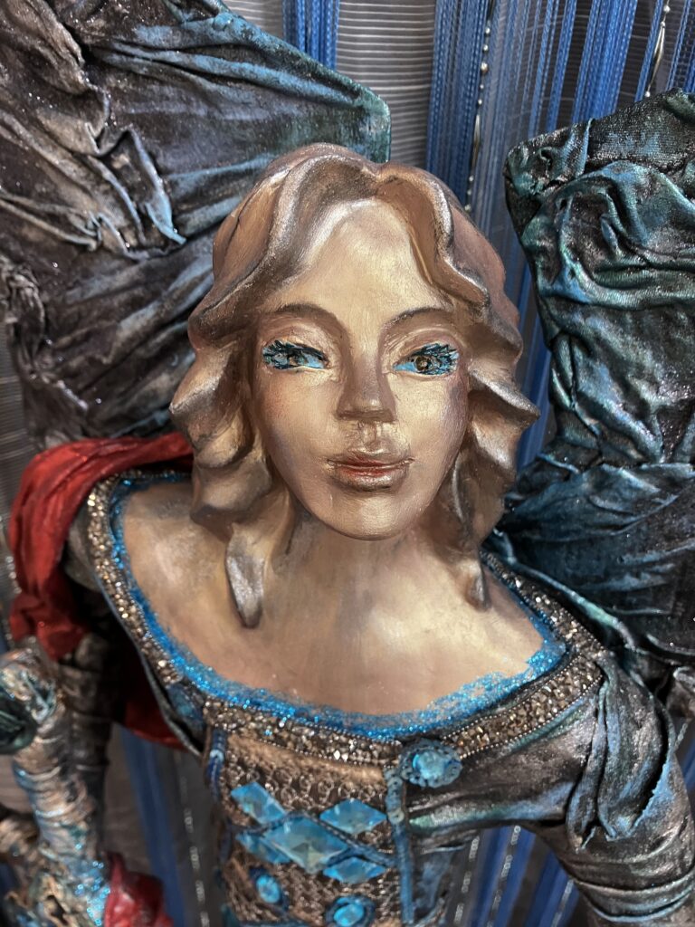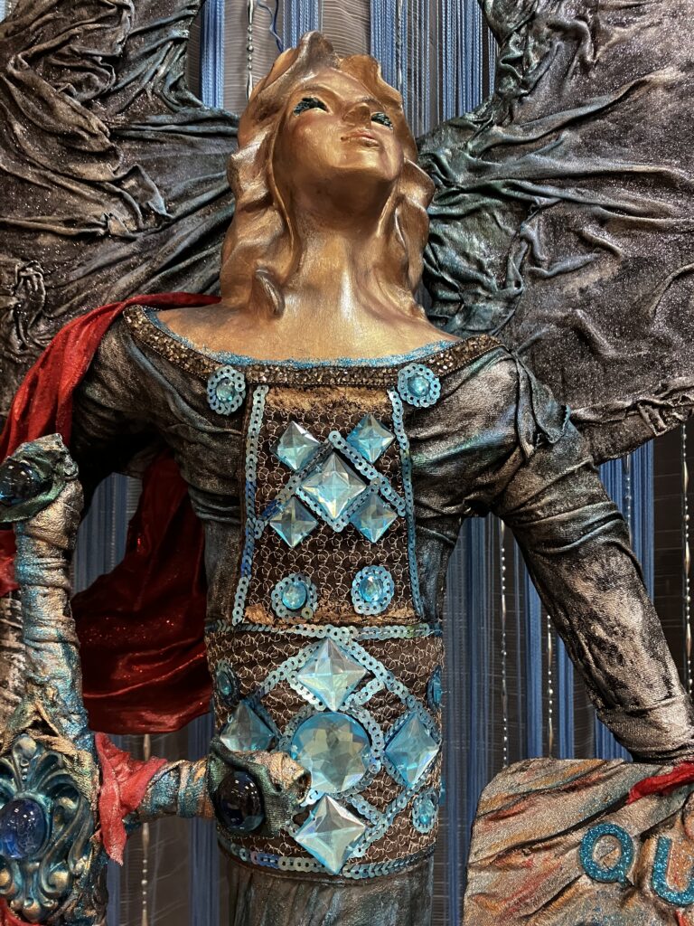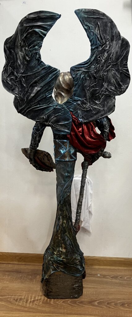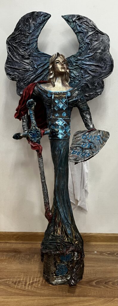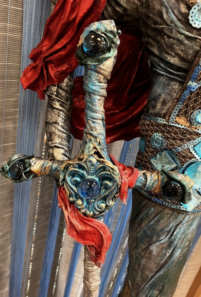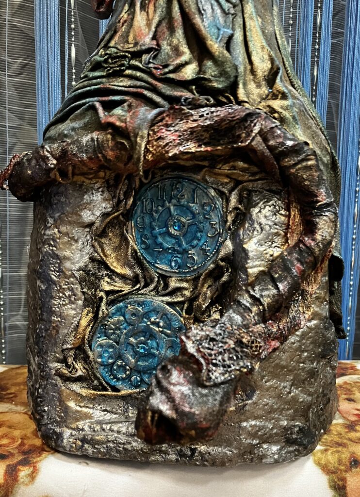 Paverpol, ručne modelovaná tvár, meč, štít,had ako symbol zla,hodiny ako symbol času, Acryl, trblietky, V:115cm, Š:48cm