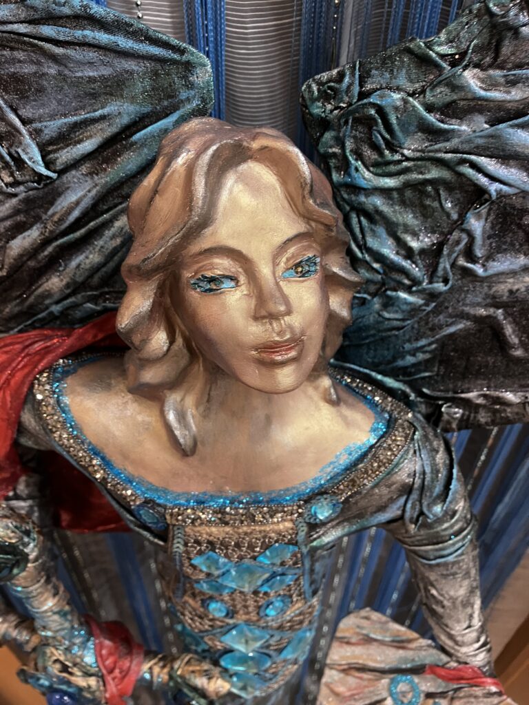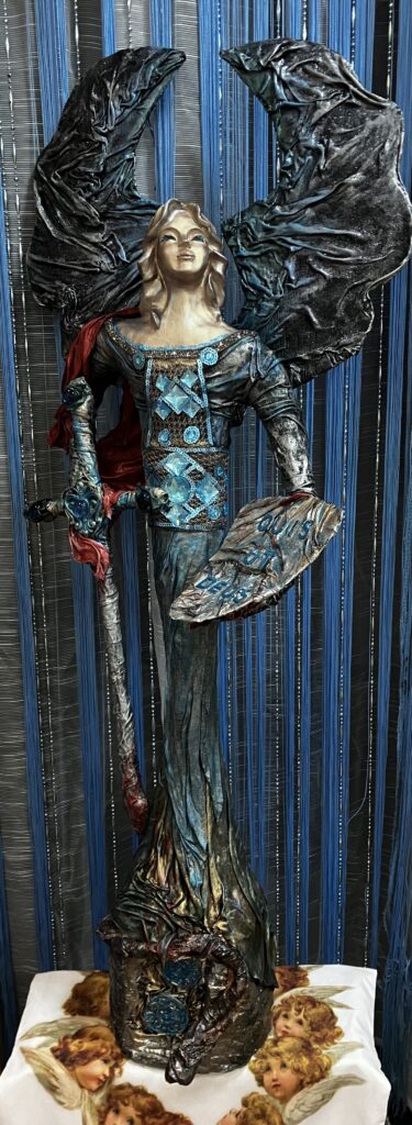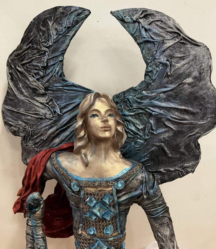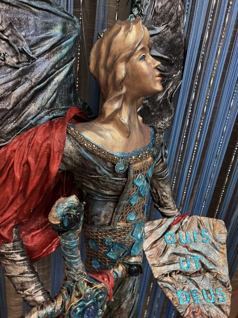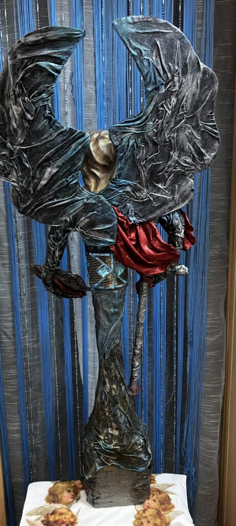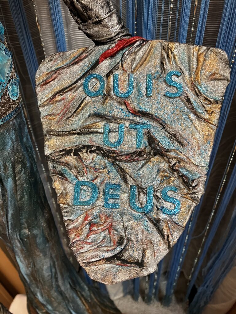 Paverpol, ručne modelovaná tvár, meč, štít,had ako symbol zla,hodiny ako symbol času, Acryl, trblietky, V:115cm, Š:48cm