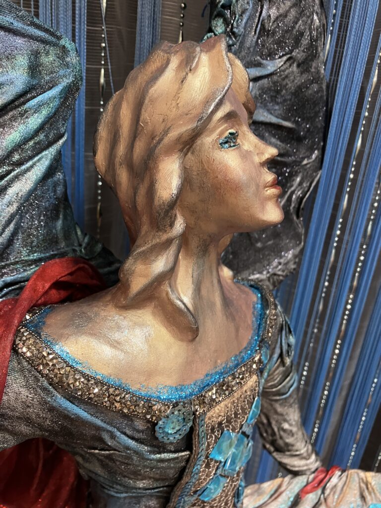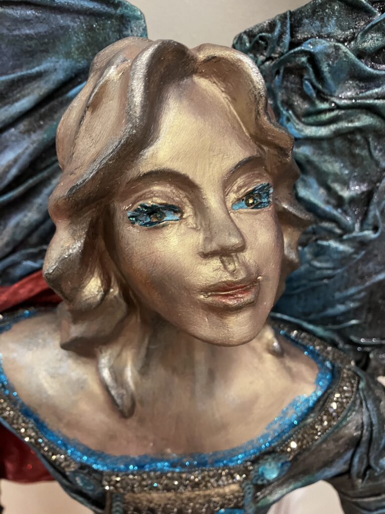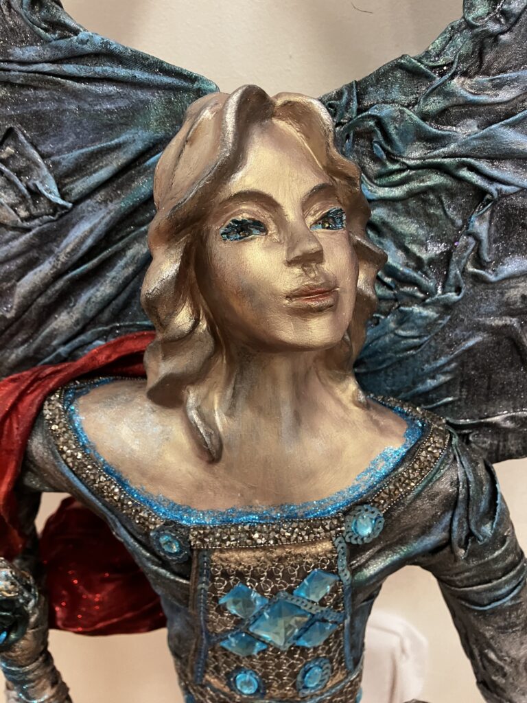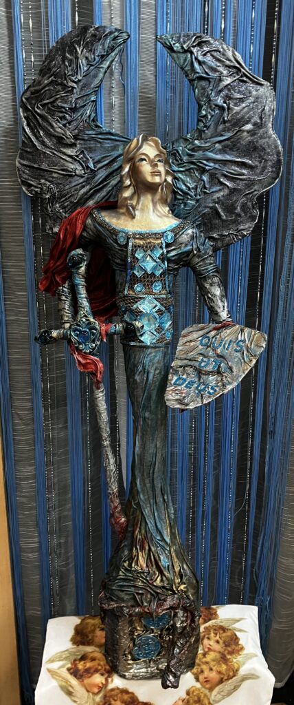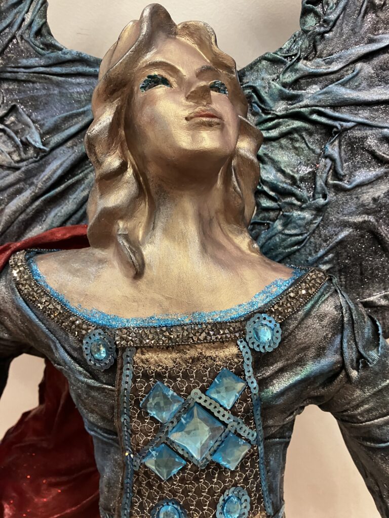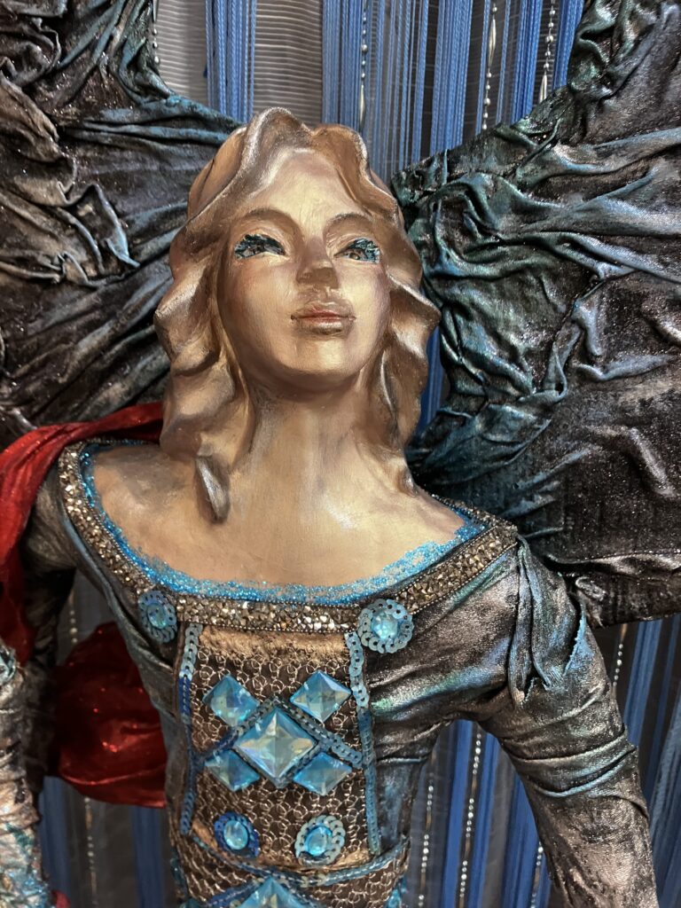 Paverpol, ručne modelovaná tvár, meč, štít,had ako symbol zla,hodiny ako symbol času, Acryl, trblietky, V:115cm, Š:48cm
