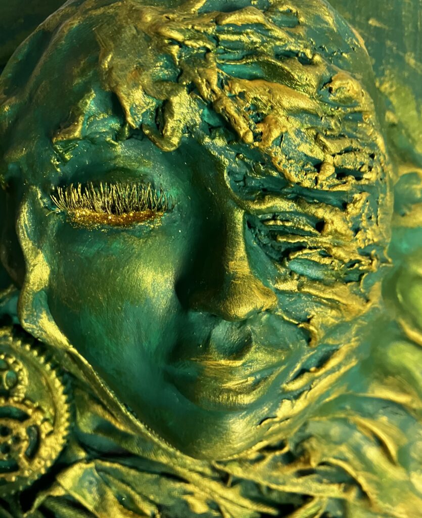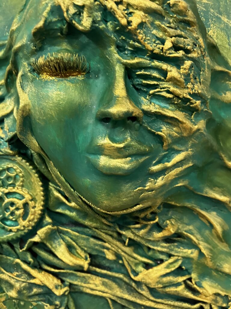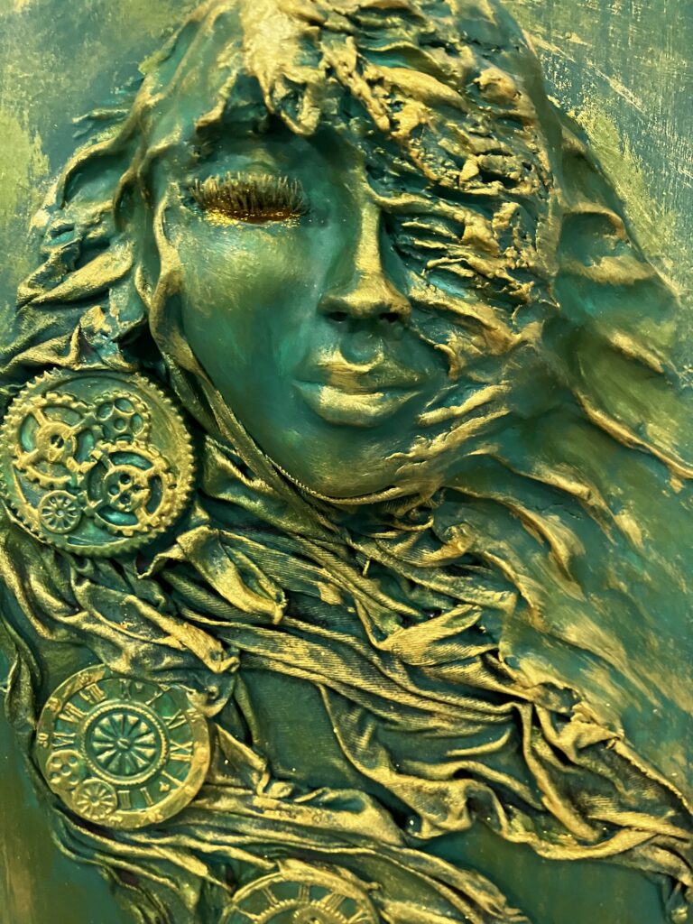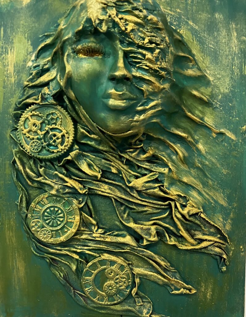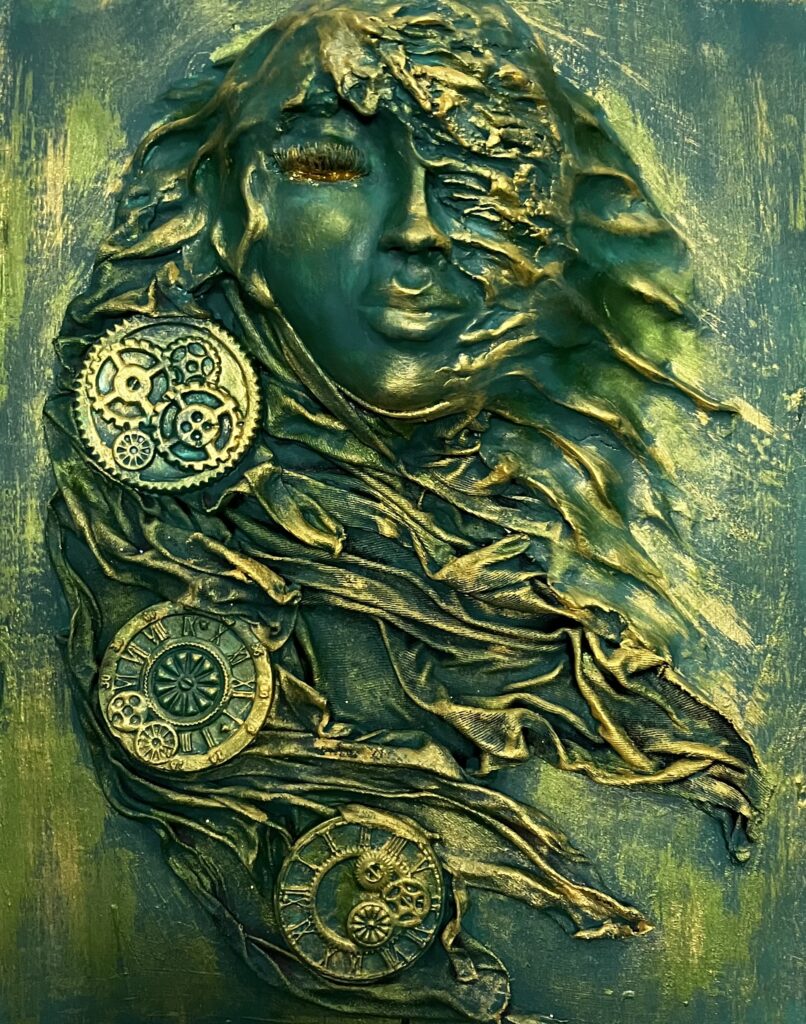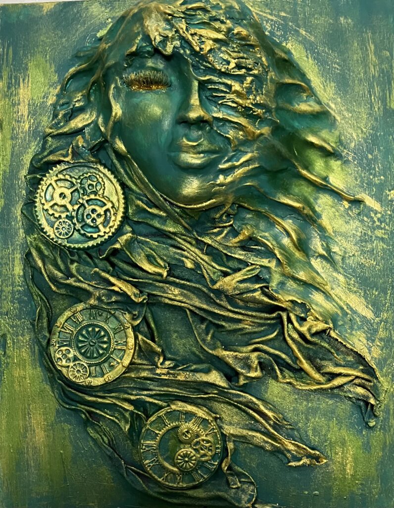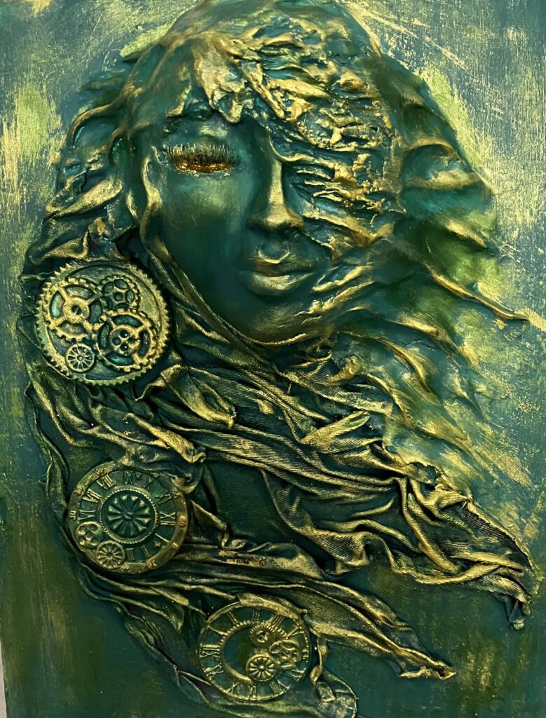 Drevená doska 26/33cm, ručne modelovaná tvár, Paverpol, trblietky,hodiny ako symbol času, acryl