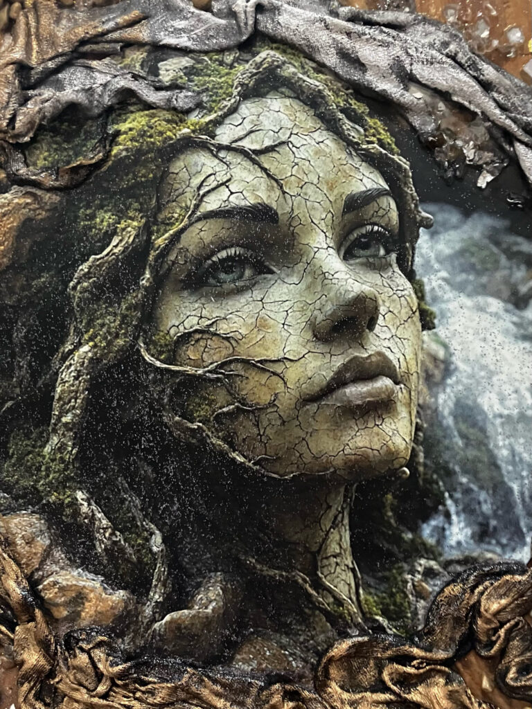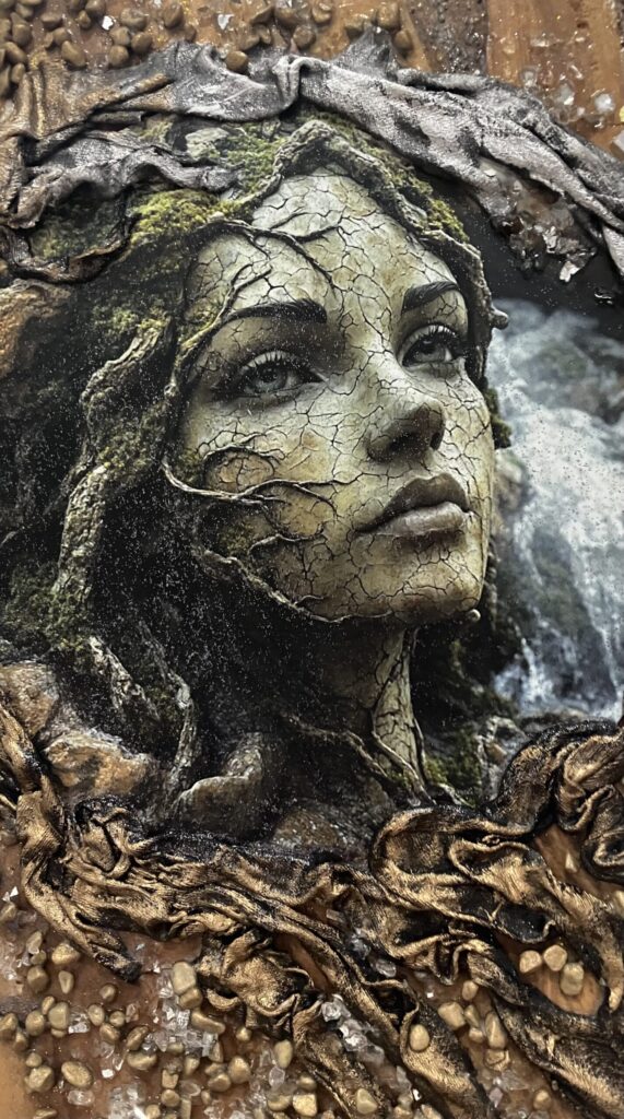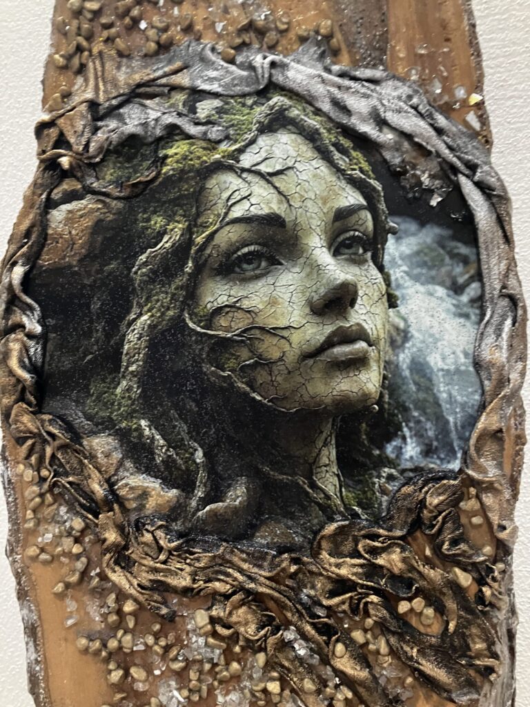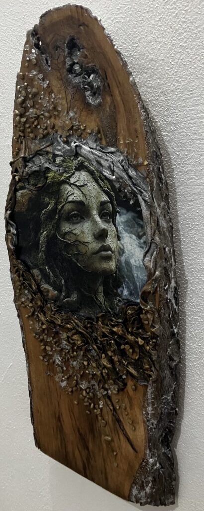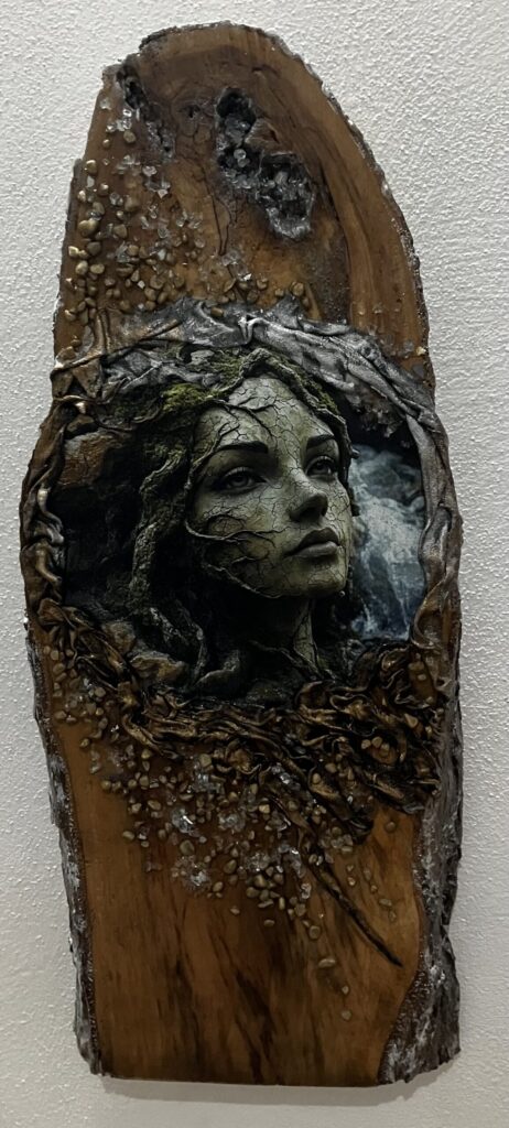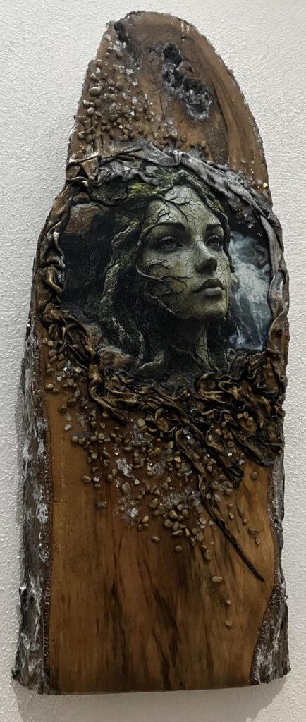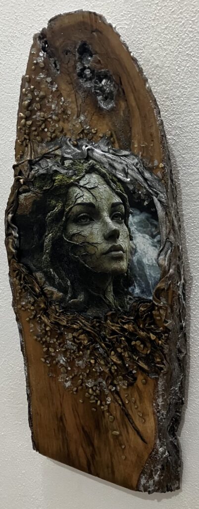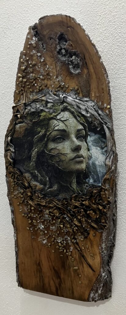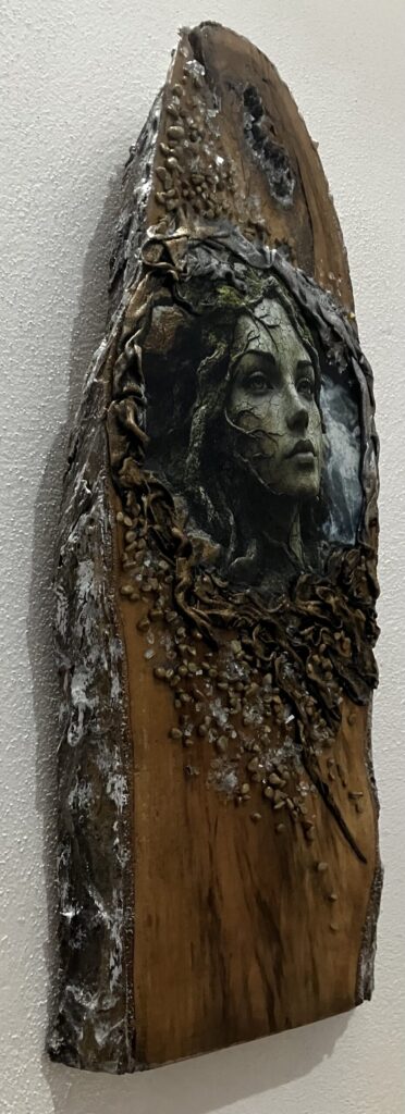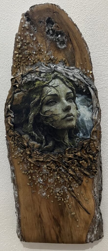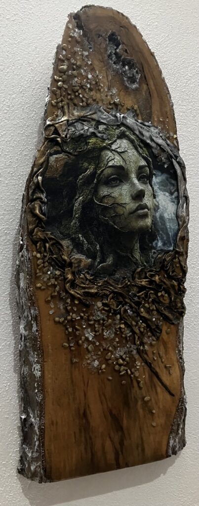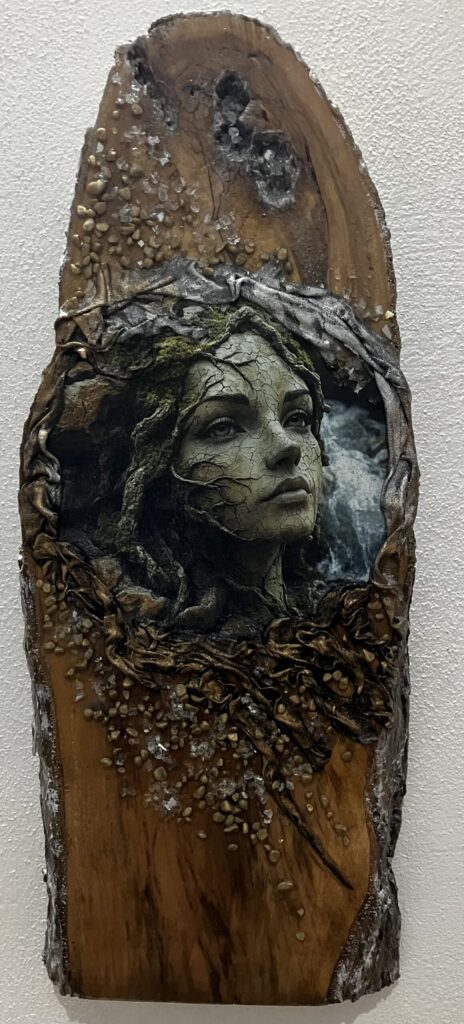 Drevená doska opracovaná s kôrou , hrúbka:4cm, V:55cm, Š: 22cm, Paverpol, trblietky,kamienky